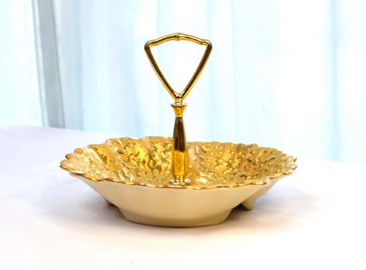 The first piece of Weeping Gold was produced by Kingwood Ceramics in East Palestine, Ohio, in the late 1930s to early 1940s. The procedure involved glazing pottery with a textured glaze, which was followed by a layer of molten gold. The texture under the gold gave a dripping, mottled effect, which was thought to look like tears, so the resulting finish was dubbed “Weeping Gold”. The process was never patented, so Weeping Gold ware was made by a variety of manufacturers, many of them right here in Northeast Ohio.